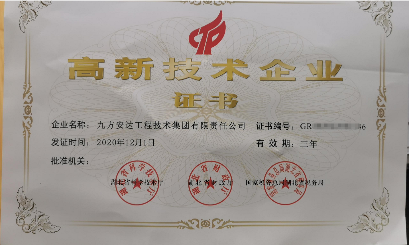 2020年12月1日,九方安达工程技术集团有限责任公司(下称:九方检测)被认定为高新技术企业,并由湖北省科学技术厅、湖北省财政厅、国家税务总局湖北省税务局联合颁发《高新技术企业证书》,正式迈入了高新技术企业的行列。
