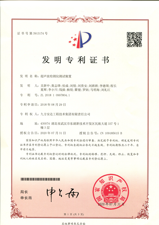 九方检测超声波检测仪测试装置专利证书
